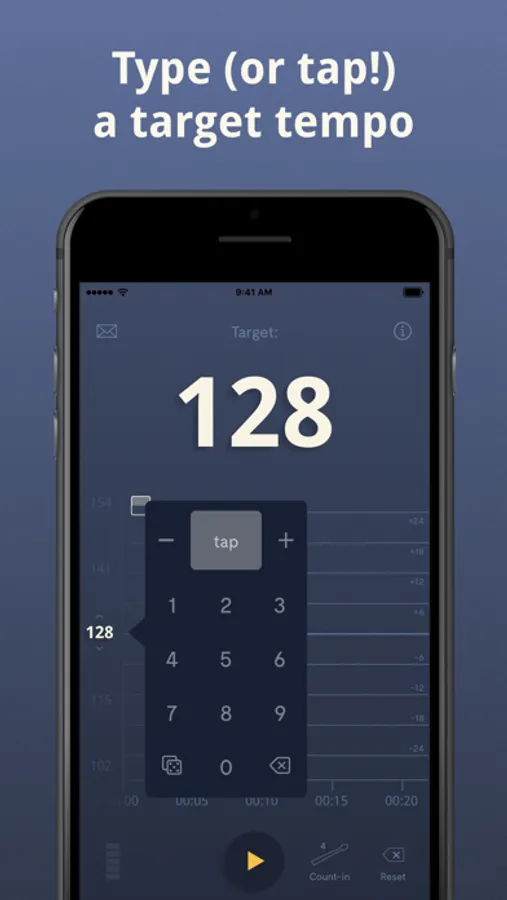 - Tempo keyboard. A special tempo keyboard (with tap pad) lets you set a target tempo easily and intuitively.