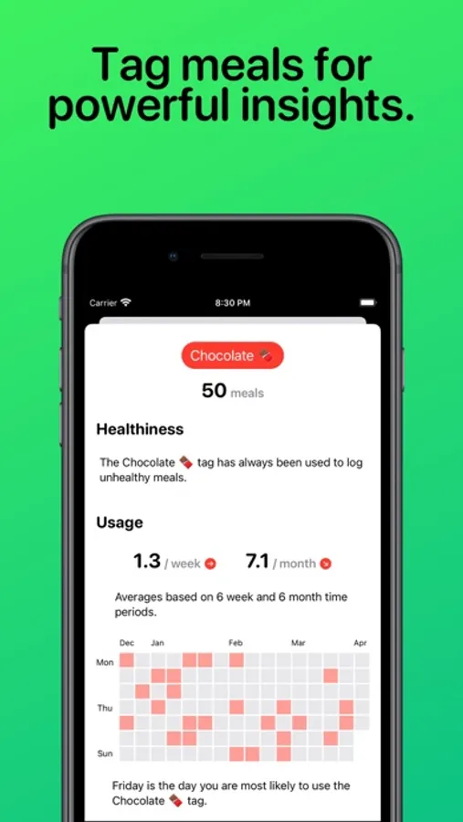 * Low carb? Gluten free? Chocolate? Use tags to optionally gain extra insight into your meals.