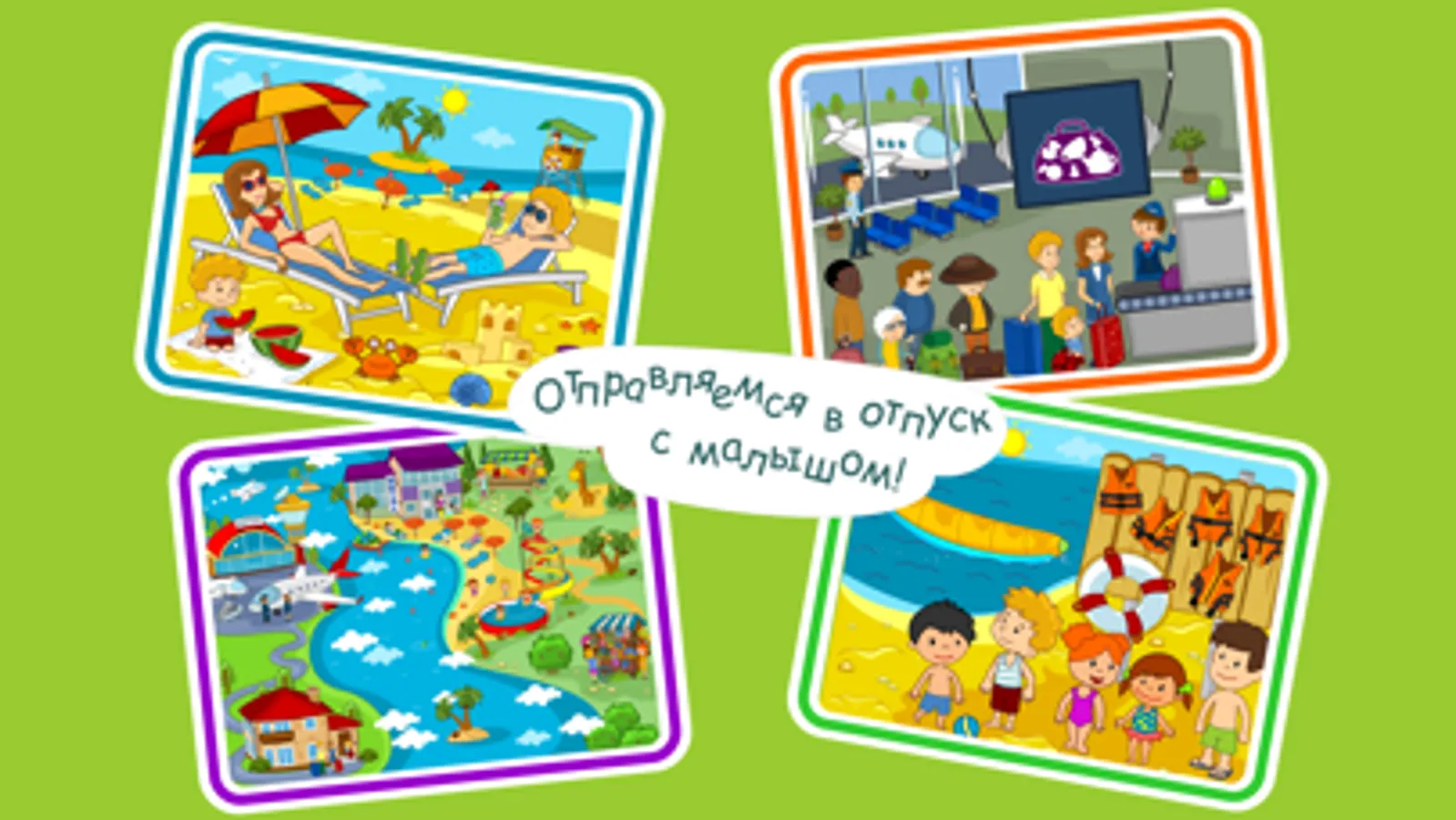 С нашим новым приложением малыш узнает и изучит все стадии приятных отпускных хлопот: от сбора чемодана, регистрации на рейс и сканирования чемоданов в аэропорту, до катания на катамаране, поиска подводных сокровищ в акваланге и катания на настоящем джипе по джунглям!