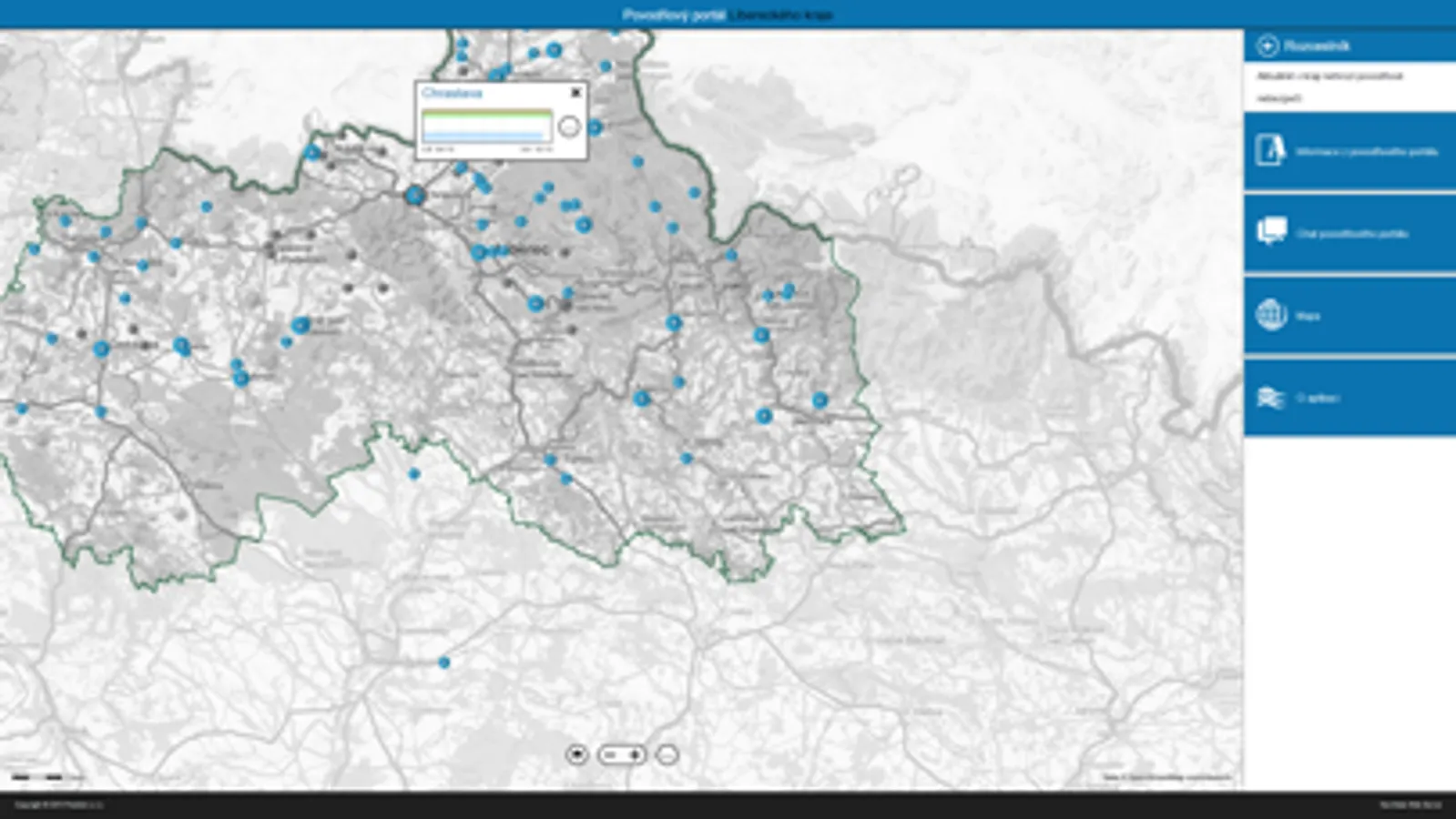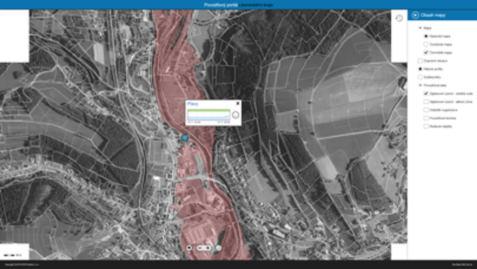 - zobrazení dalších informačních vrstev z Geoportálu Libereckého kraje (záplavová území, povodňové komise, rizikové objekty a jejich rizika atd.).