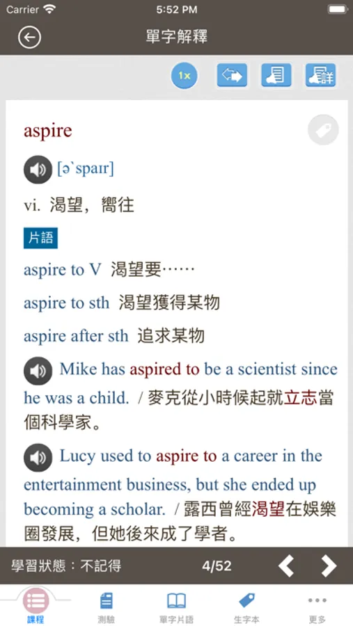 * 每個單字、片語和例句等都有專業美籍播音員真人發音。