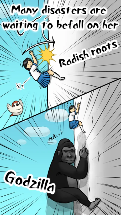 The high school girl is single-mindedly determined to climb the towering radishes.