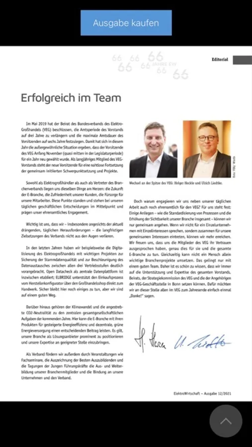 Die Fachzeitschrift ElektroWirtschaft ist das Organ des Bundesverbandes des Elektro-Großhandels (VEG) e.V. und erscheint monatlich. Sie berichtet über aktuelle Entwicklungen der Elektrobranche. Von der redaktionellen Zielsetzung her wendet sich die Zeitschrift bewusst mehr an den Kaufmann als an den Techniker in den Betrieben. Sie unterscheidet sich somit von der Mehrzahl der übrigen, vorwiegend technisch ausgerichteten Fachzeitschriften der Branche. Bevorzugte Themen sind stark wirtschaftlich akzentuierte Berichte über den Elektrogroßhandel, die Elektroindustrie und das Elektrohandwerk. Neue Produkte, Interviews mit Branchenvertretern, ausführliche Berichte über Messen und Veranstaltungen stehen dabei im Fokus. In nahezu jedem Heft übermitteln Vorstand und Geschäftsführung des VEG den Elektrogroßhändlern Anregungen, Kommentare und Stellungnahmen zu aktuellen marktpolitischen Fragen. Die App-Ausgabe enthält die kompletten redaktionellen Inhalte der Printausgabe der ElektroWirtschaft. Videos, Bildergalerien, Verlinkungen und weitere multimediale Elemente ergänzen die Printausgabe und bieten dem Leser informativen Mehrwert.