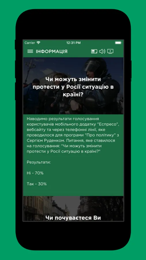 До речі, в додатку доступний прямий ефір телеканалу Еспресо. Він доступний також під час читання новин або участі в голосуваннях.