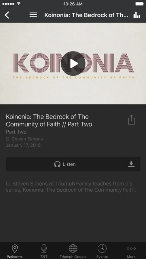 This app features the video/audio teaching of G. Steven Simons, the founder of Triumph Family, as well as interactive tools (connect forms, online giving, scheduled events, radio access, etc.) to help this family of faith build unity and continuity of vision on a global scale!
