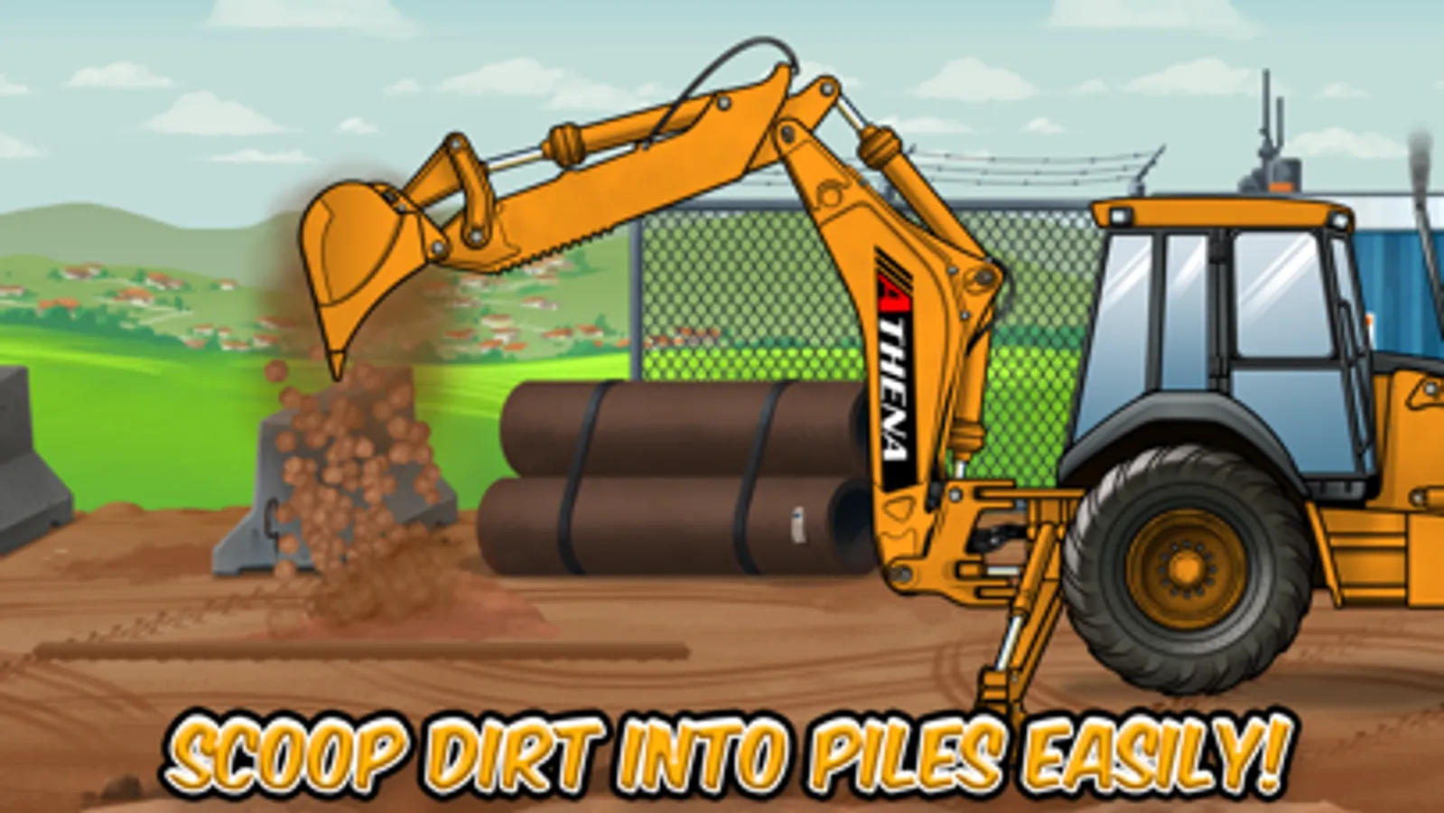 Touch anywhere on the screen to affect the game; touch the body of the backhoe to change the color of it, or tap the wheels to start and stop driving. Tap the back arm of the backhoe to work the digger scoop; press and hold anywhere on the screen and the bucket will follow your finger. Tap the front of the backhoe to work the loader bucket; press and hold anywhere on the screen and the bucket will follow your finger. Raise it high enough and dump out dirt, and collect more dirt by driving and scooping up dirt piles. Dig and make piles to their maximum size to score points.