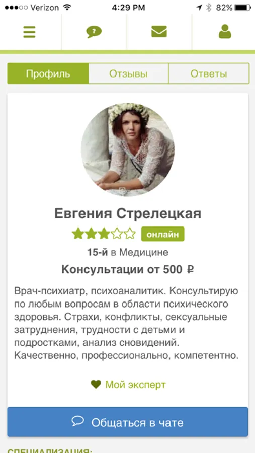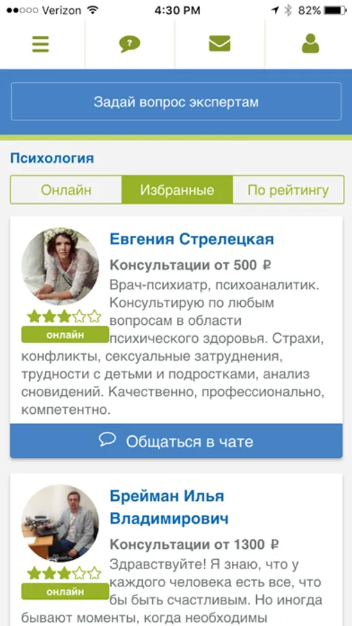 - выбрать эксперта, анализируя профили и отзывы клиентов, и тут же проконсультироваться с ним в приватном чате.