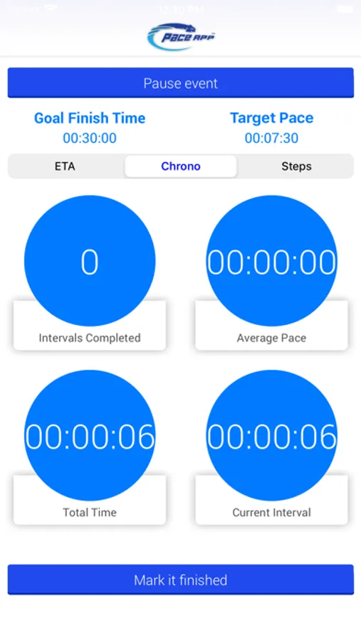 → In the ETA Mode, at the end of each interval (Mile/KM) the Pace App provides the patented projected finish time (ETA) as well as the variance to goal finish time.