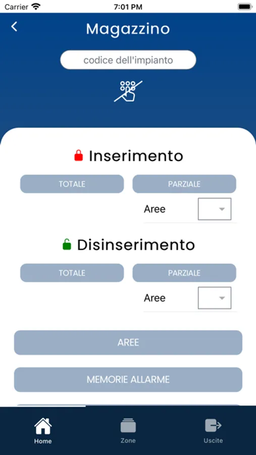 - inserire e disinserire l'impianto o ciascuna delle aree configurate;