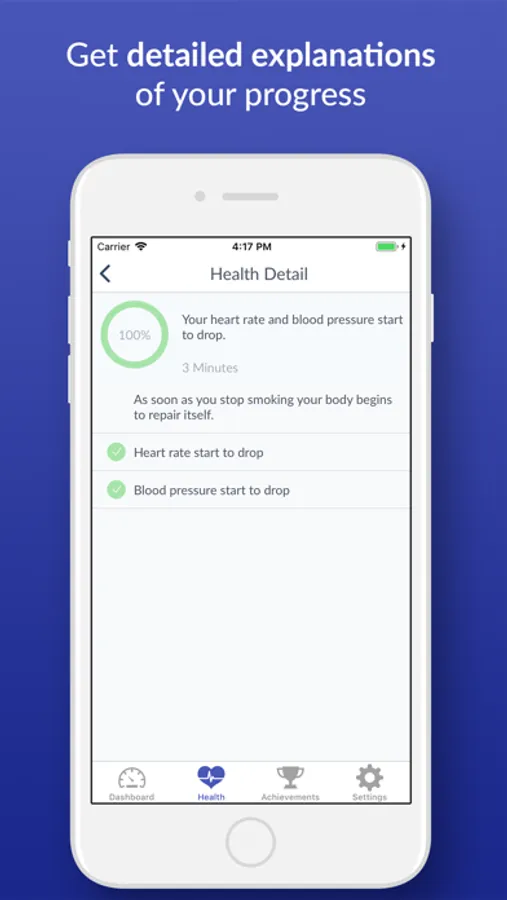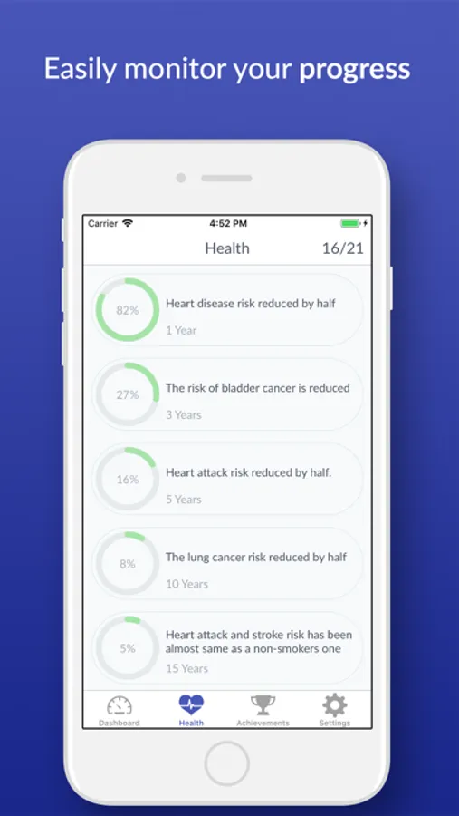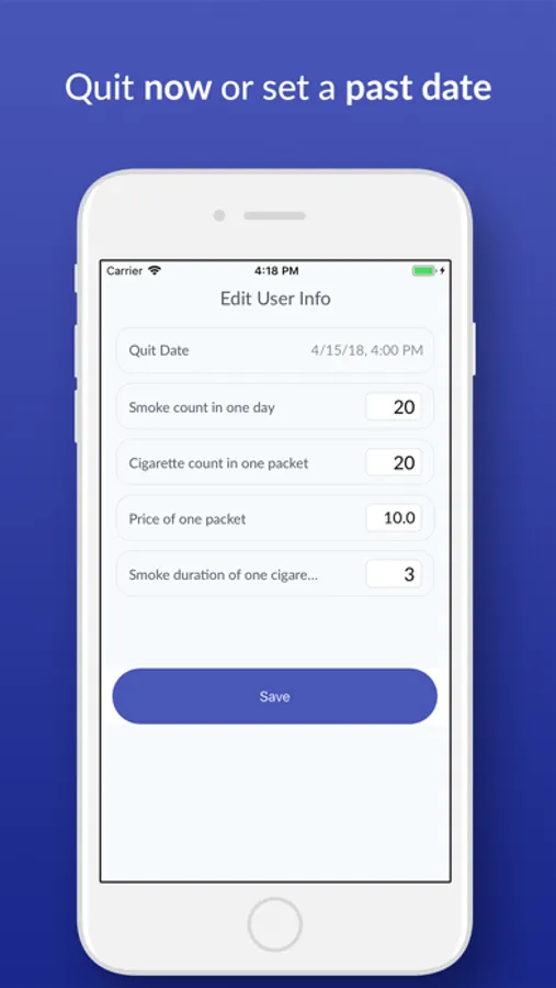 Simply select your quit date and enter your smoking habit details then watch as various indicators display your circulatory and lung function improvements, your savings, and much more.