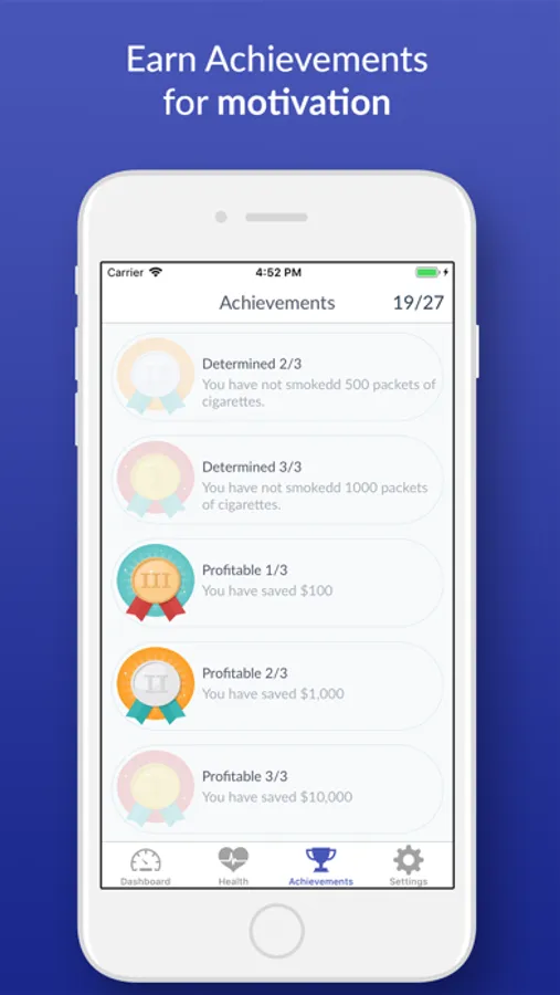 This App keeps track of the cigarettes you did not smoke and how much money you have saved. Furthermore, it shows the benefits of quitting based upon the latest medical knowledge and statistics.