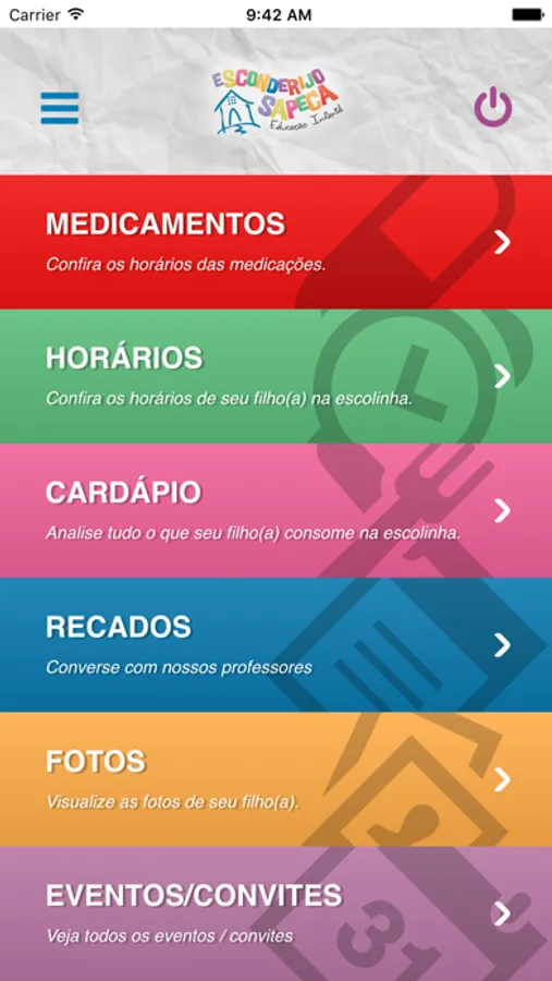 O aplicativo da Esconderijo Sapeca ajuda você a ficar perto do seu filho mesmo enquanto ele está na escola! Acompanhe o dia-a-dia dos alunos na escola, observando a rotina das crianças e acessando fotos e convite pra eventos.