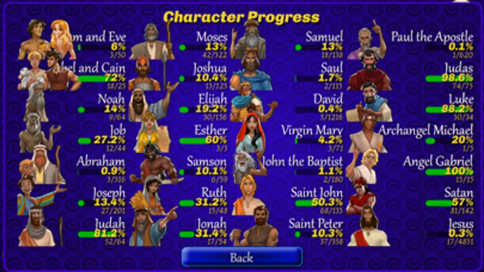 • Character Progress shows you how you are progressing while learning about your favorite characters in each scripture verse