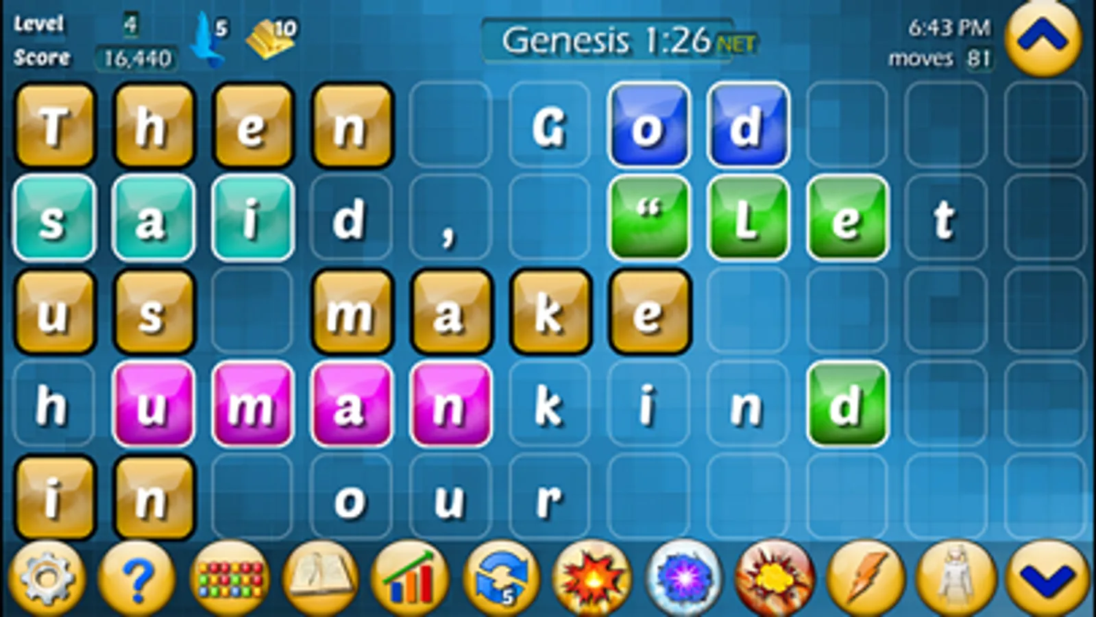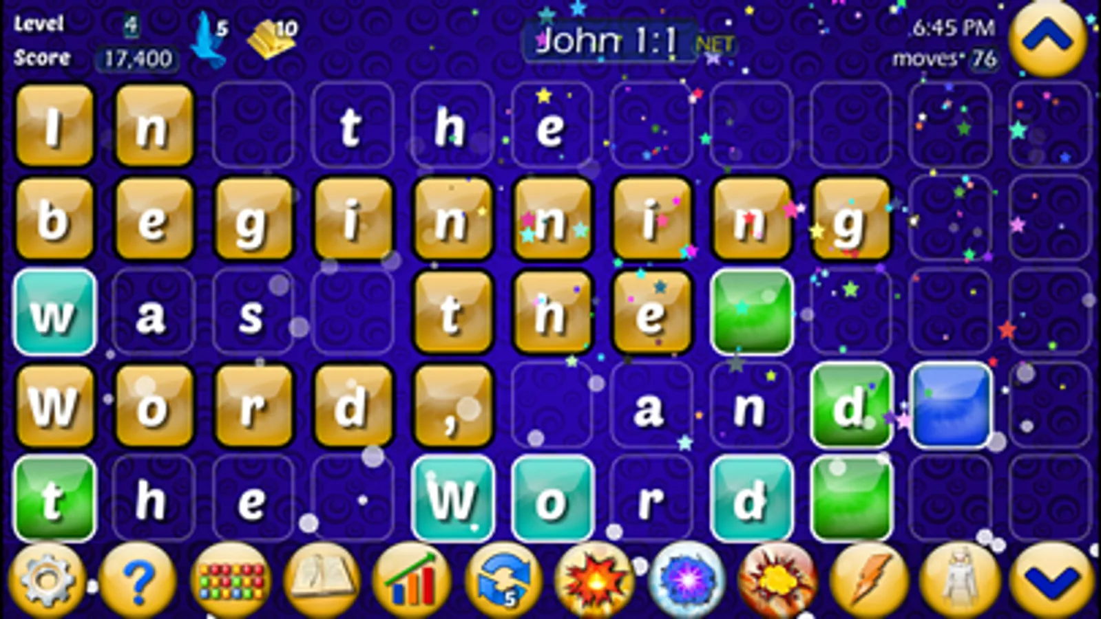 Download Play The Bible for free and enjoy this unique, patent-pending word matching game and learn Bible verses while you have fun playing through!