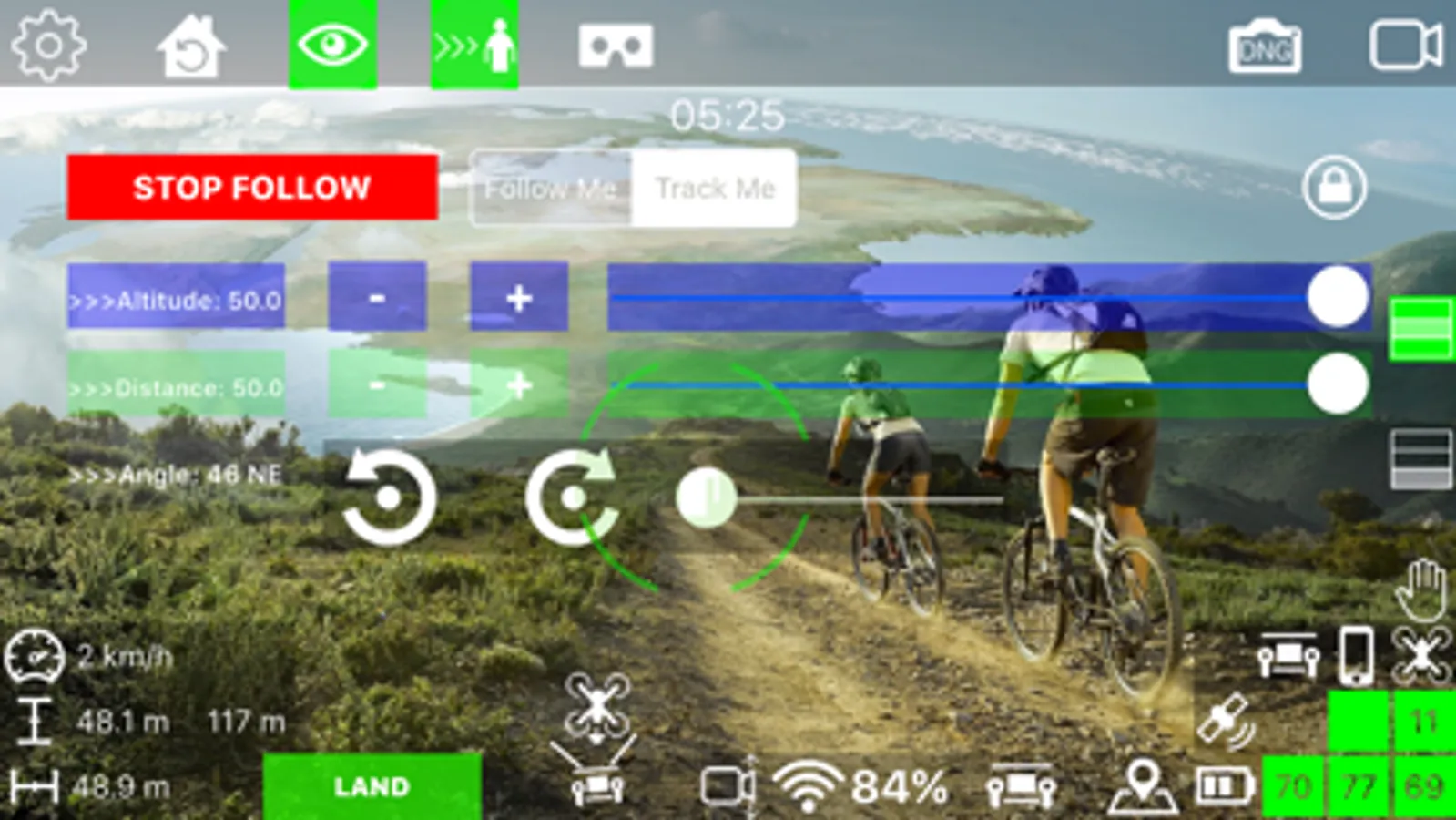 Just choose the distance and the elevation from which you what to be followed and enjoy the best follow algorithm out there!!