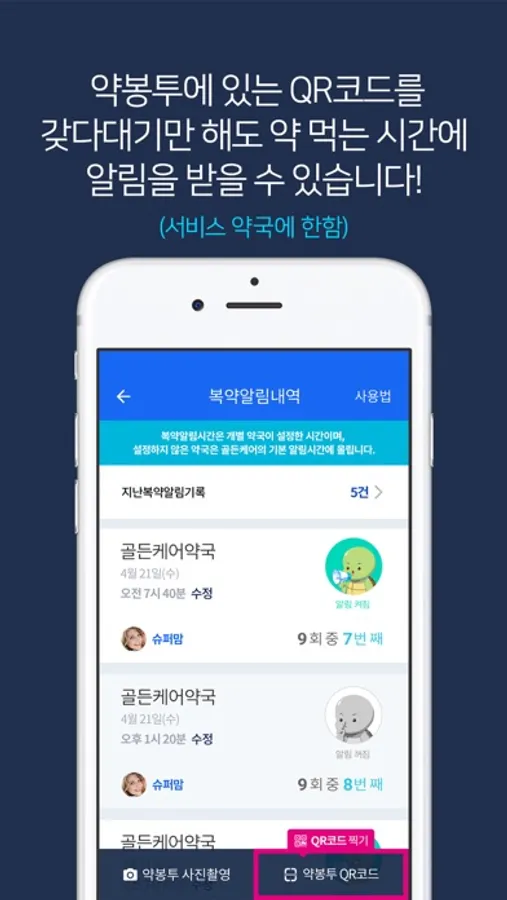 - 병원에서 처방, 약국에서 조제받은 처방전/약봉투를 사진만 찍으면 복약해야 할 시간에 맞춰 알림을 줍니다.