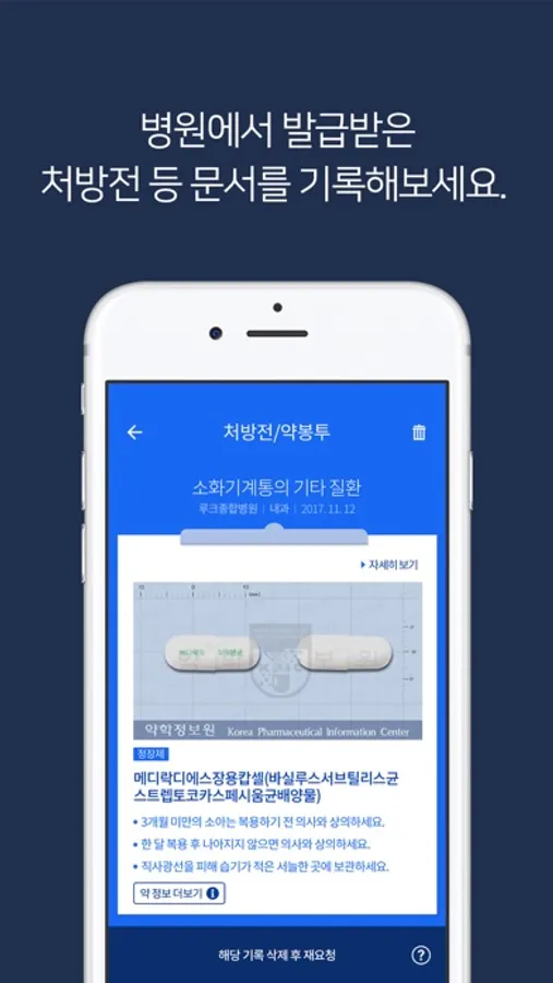 - 나와 우리 가족의 처방전, 진료비계산서 등 진료, 건강 관련 문서, 실제 알약, 의약품바코드를 카메라로 찍어 기록하고 관리할 수 있습니다.