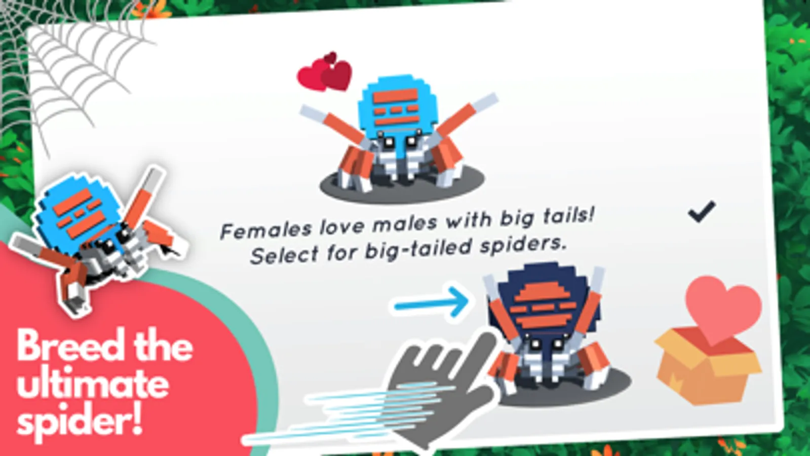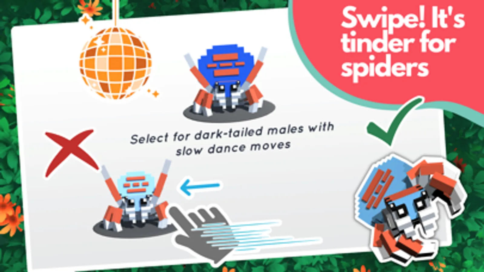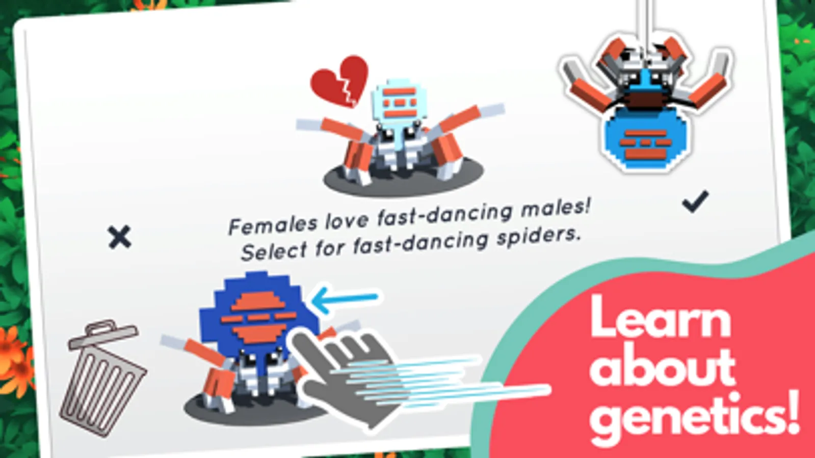Swipe left or right on each dancing peacock spider to create spiders with specific traits. The peacock spiders vary in three traits: tail size, tail colour, and dance speed. As you explore each trait, you’ll learn about correlated selection and how the value of a trait changes the relative effect of selection, and why populations vary in phenotypes.