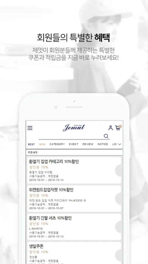 신상5% , 생일축하쿠폰 10% , 평생회원전환시 2,000원 , 앱 다운로드시 1,000원 그리고 무료배송까지!