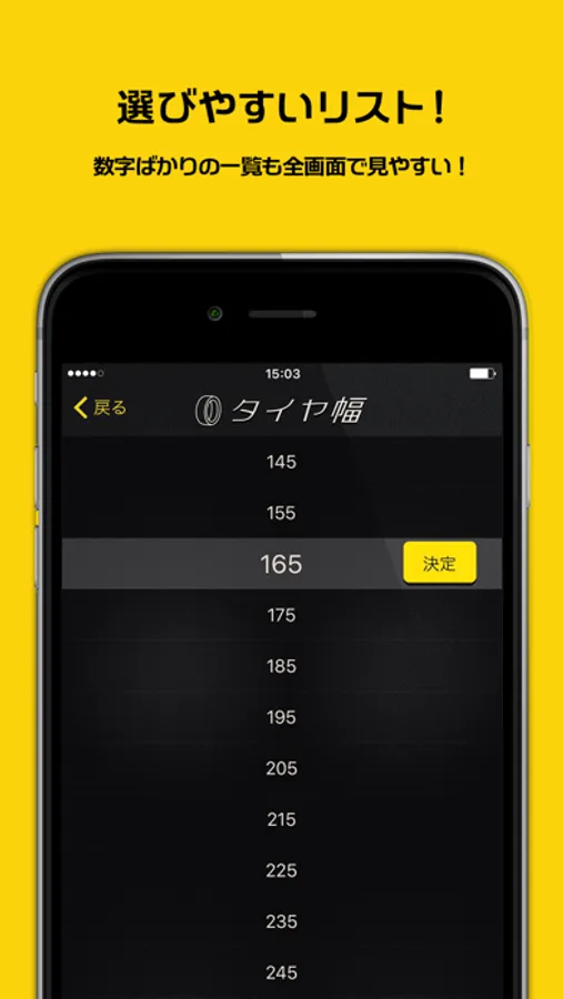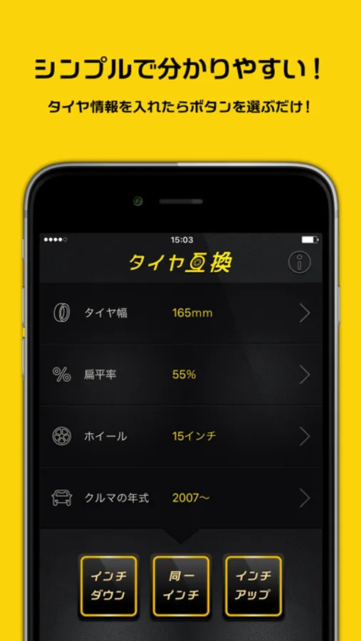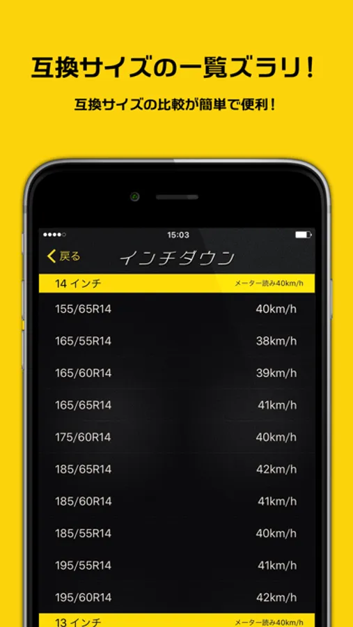 このアプリは、インチアップしたい場合や冬タイヤ用にインチダウンをする際に、簡単に推奨サイズが確認できます。