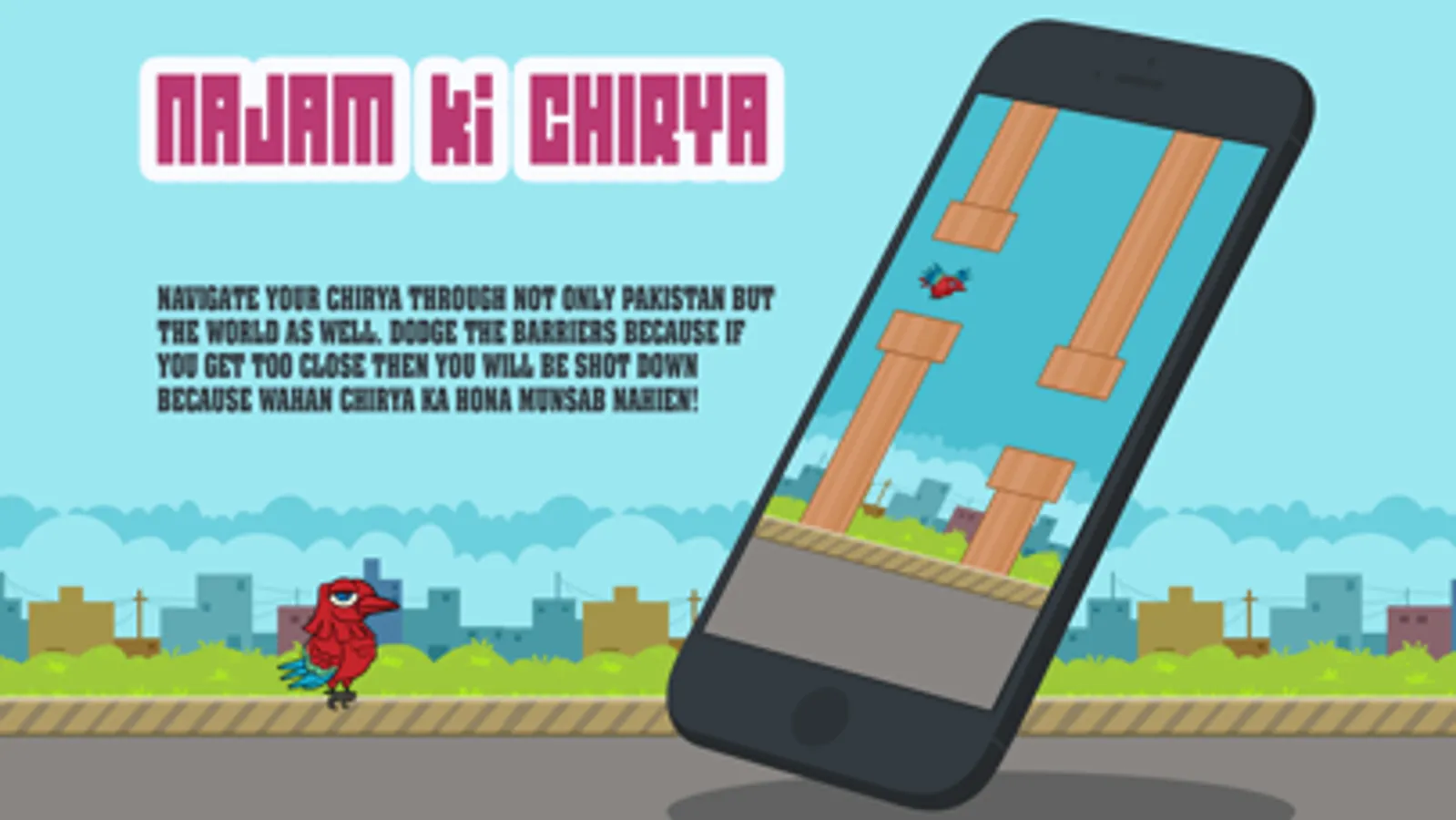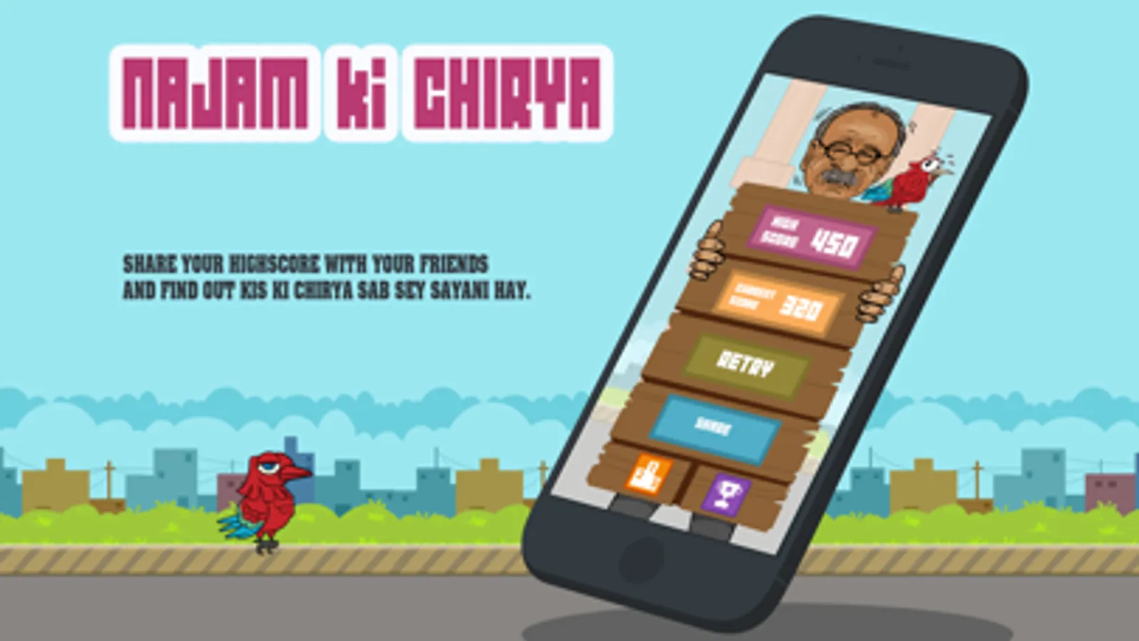 Najam's chirpy chirya (flappy bird) is on it's way to collect parchiyan about Imran Khan (PTI) & Nawaz Sharif (PMLN). Help the chirpy chriya fly & avoid pillar with posters featuring Go Nawaz Go, Talking Kaptaan, Sheeda Run, Sultan Rahi, Aamir Liaquat, Moto Racers, Chhota Bheem & many more