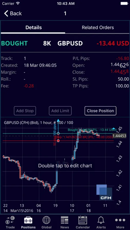 • Trade directly from charts. Add and adjust Pending Orders (Limits and Stops)
