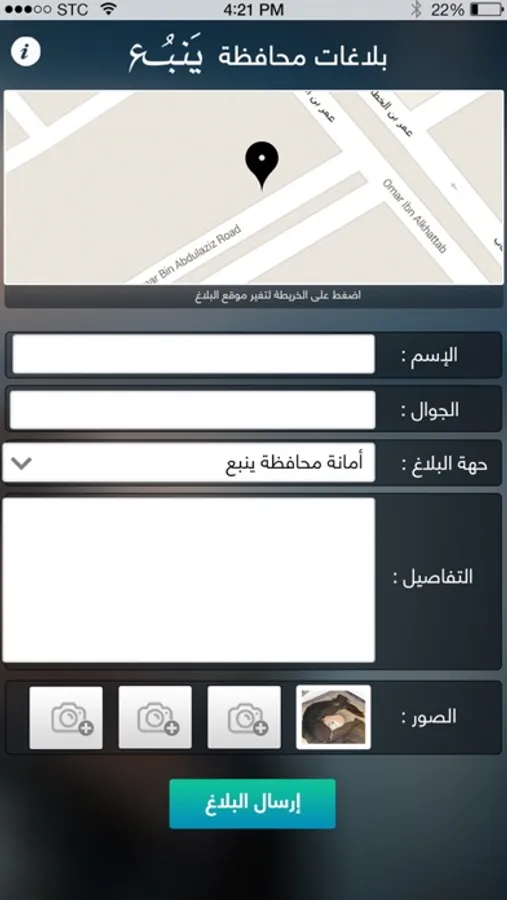 تطبيق بلاغات ينبع هو تطبيق يسمح للمستخدم ارسال بلاغ الى الجهات الرسمية في مدينة ينبع حيث يمكن للمستخدم من اضافة معلومات وصور عن البلاغ او الملاحظة مع إمكانية تحديد موقع الحادثة تلقائياً على الخريطة.