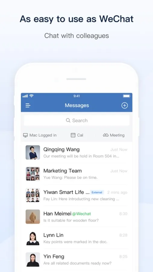 WeCom is a business communication and office collaboration tool developed by Tencent WeChat Team. WeCom provides the same communication experience as WeChat and connects with WeChat in an all-round manner. It also offers productivity tools such as Document, Meeting, Email, Calendar, and WeDrive, and flexible OA apps for effective business communication and management.