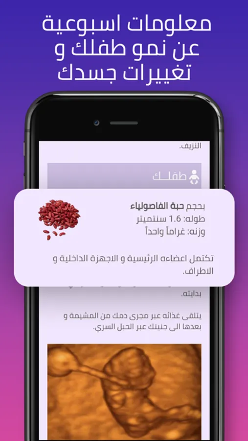• معلومات مفصلة اسبوعية عن نمو طفلك طوال الاربعين اسبوع.