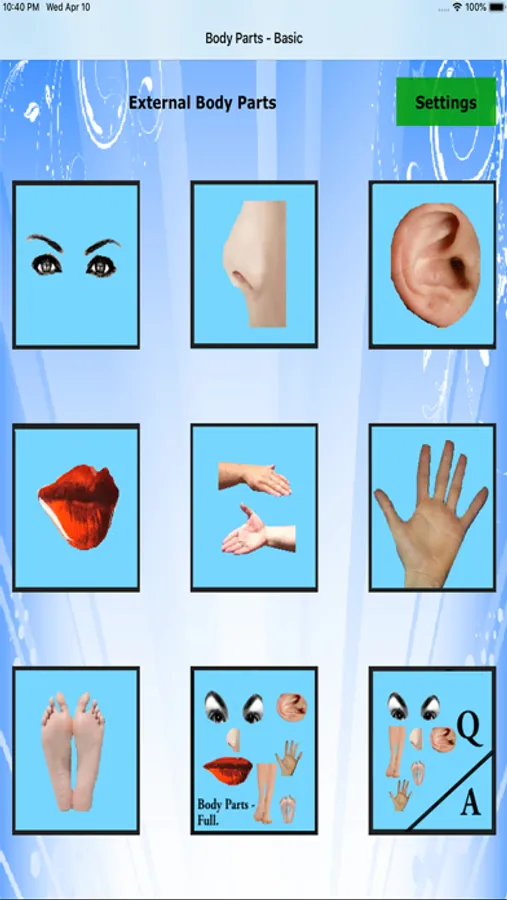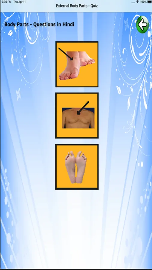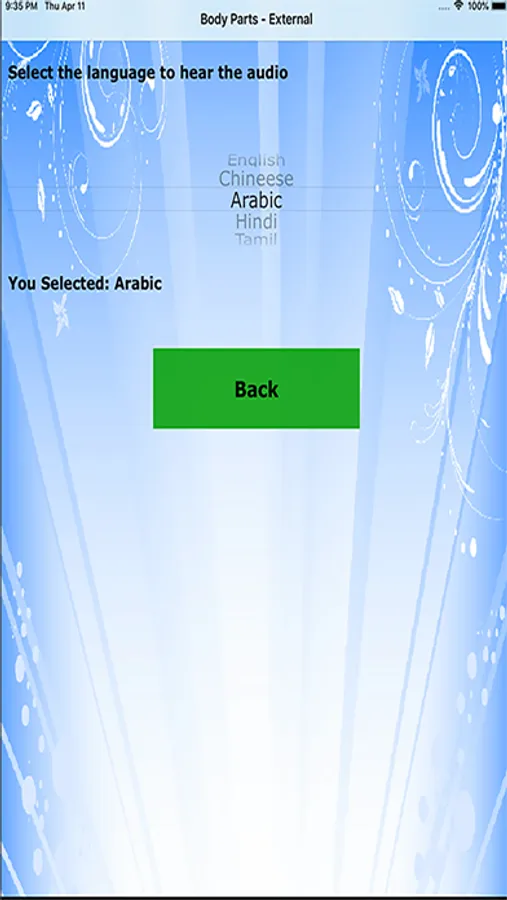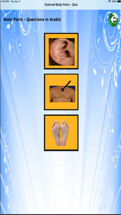 This application shows body parts in languages- English/Arabic/Chinese /Hindi and Tamil. Questions at the end of the section help you to revise learning.