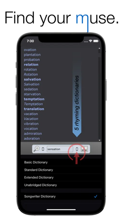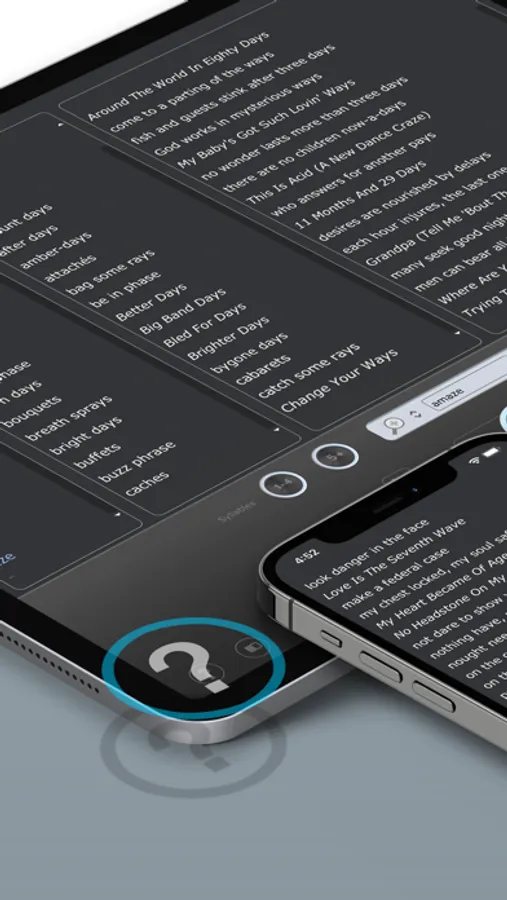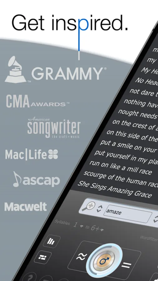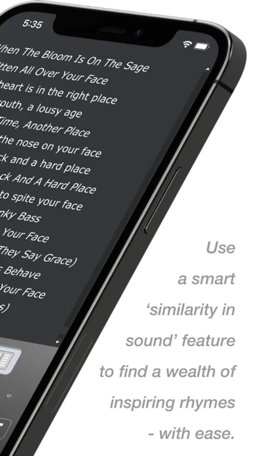 Get inspired by over 330,000 entries, 30 different rhyme types and one of the largest collections of American sayings, clichés, idioms and hit song titles. Enjoy Rhyme Genie’s 10 million phonetic references, automatic detection of stressed syllables, true multi‑syllabic rhymes and intuitive control over the ‘similarity in sound’ between search words and rhyme mates.