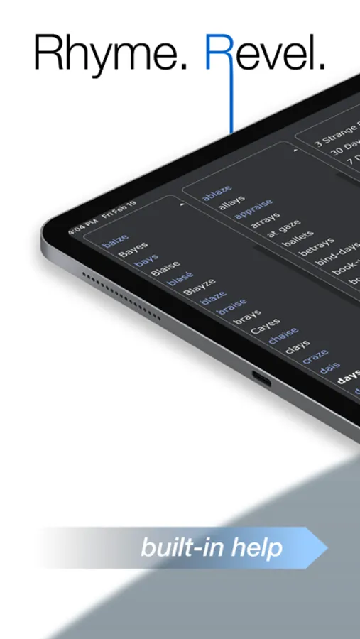 Break free from the limitations of traditional rhyming dictionaries with 30 different types of rhymes: Additive Rhyme (augmented rhyme), Alliteration (head rhyme), Amphisbaenic Rhyme, Apocopated Rhyme, Assonance (oblique rhyme), Broken Rhyme, Consonance (suspended rhyme), Diminished Rhyme, Double Assonance, Double Consonance, Elided Rhyme, Family Rhyme, Feminine Pararhyme (minor accent rhyme), Final Syllable Rhyme, First Syllable Rhyme, Full Assonance, Full Consonance, Half Double Rhyme, Homophones (echo rhyme), Intelligent Rhyme, Light Rhyme (uneven rhyme), Metaphone, Pararhyme, Perfect Rhyme (true rhyme), Related Rhyme, Reverse Rhyme, Rich Rhyme (identical rhyme), Soundex, Trailing Rhyme (semirhyme), Weakened Rhyme (unaccented rhyme)