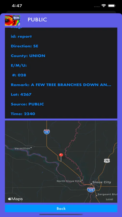 > Launch the Watch App and the app will communicate with the iOS App to get the nearest storm information and also notify the iOS App to select the storm and view the information. Click on the "Nearest" button if you would like to search the nearest storm again.