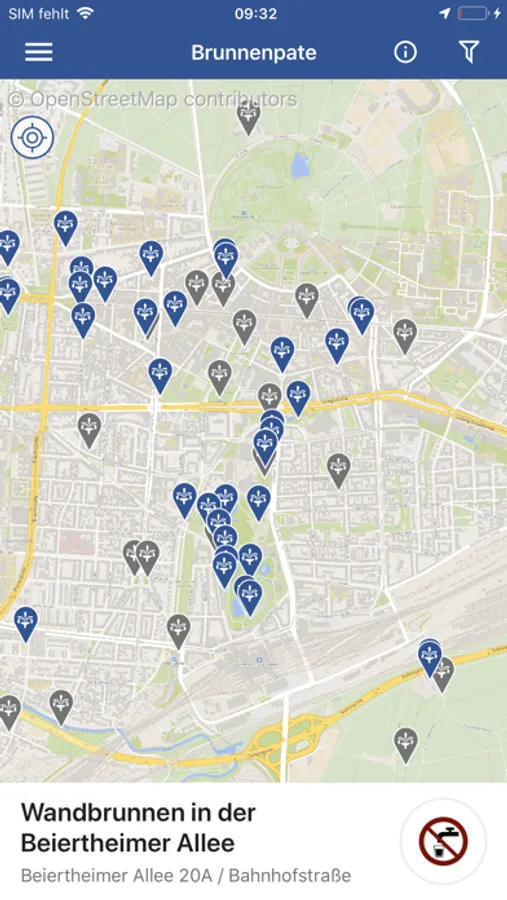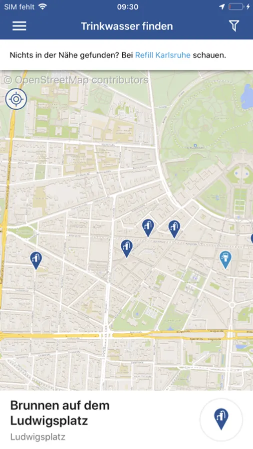 Übersichtskarte aller Trinkwasserbrunnen und öffentlich zugänglichen Trinkwasser-Spender im Stadtgebiet Karlsruhe und der Umgebung