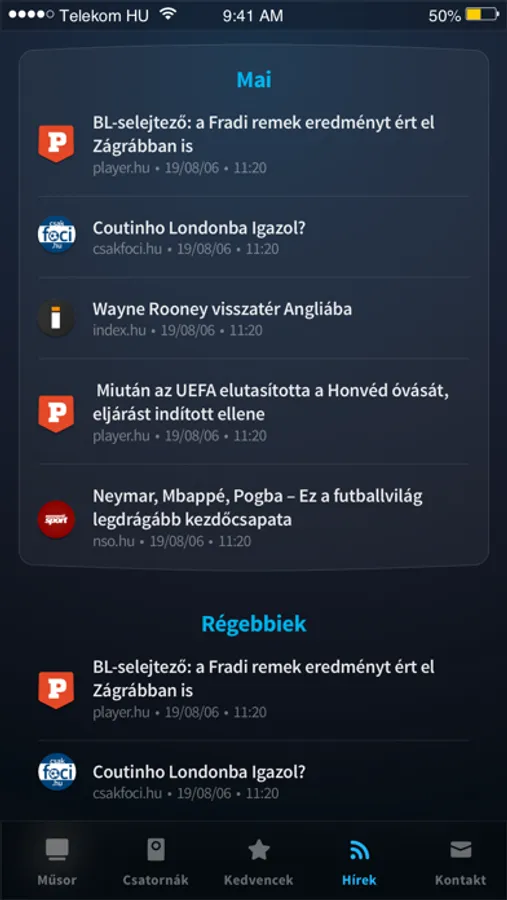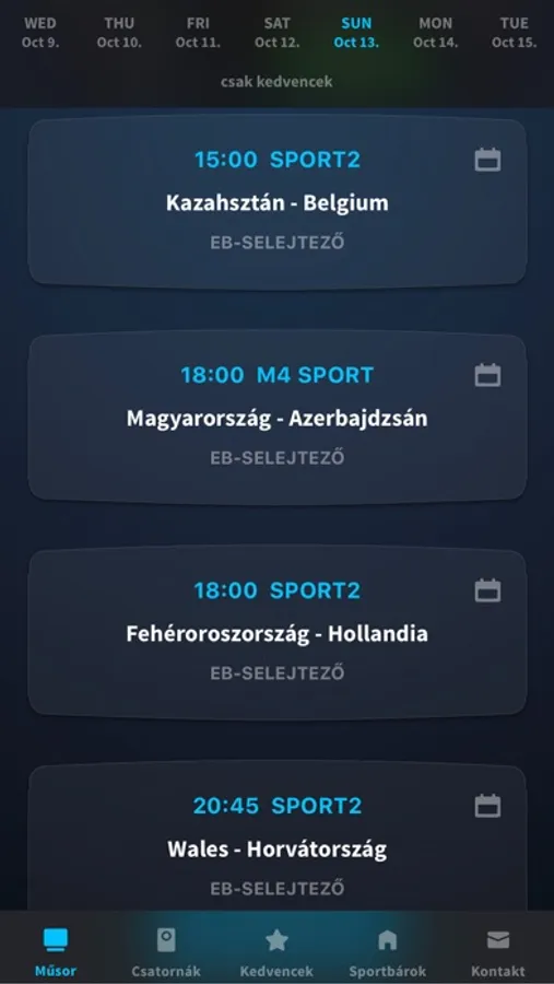 Ebben a menüpontban az adott hét összes olyan labdarúgó meccsét látod, amelyet valamelyik sport csatorna közvetít: a pontos időpontot, az adott csatornát és a bajnokság, kupa nevét. Az időpontra kattintva a telefonod naptárához adhatod a meccseket, hogy biztosan ne csússz le róluk.