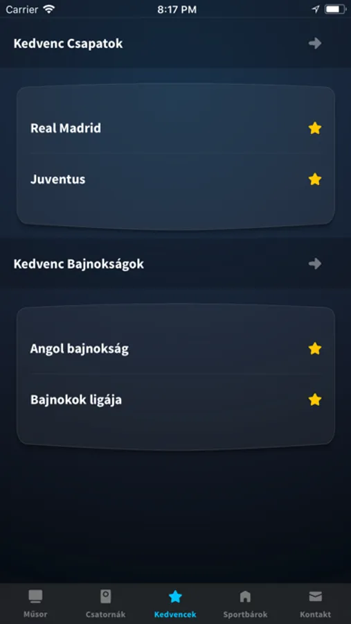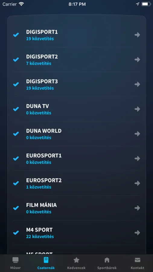 Itt találod a kiválasztott csapataid meccseit a héten. Hasonlóképpen teljes ligákat is figyelemmel tudsz kísérni, így láthatod, hogy az adott fordulóból hány meccset mely időpontokban mely csatornák fognak közvetíteni.