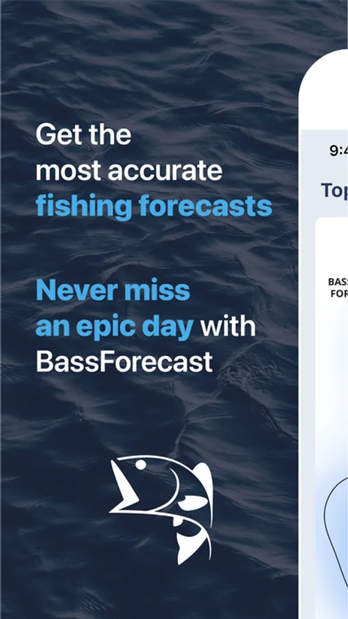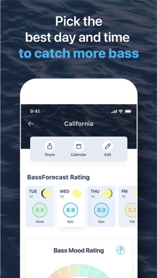 • Push Notifications of “Good” and “Epic” days to bass fish 10 days in advance