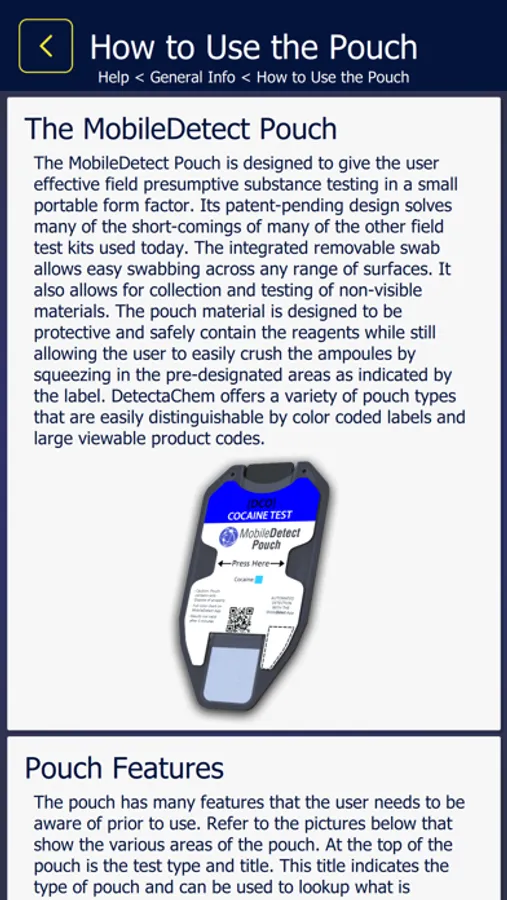 The revolutionary MobileDetect app converts your smartphone or tablet into a portable, presumptive drug detection tool. The app works with MobileDetect drug pouches which are innovative, highly accurate, low-cost test kits that use recognized National Institute of Justice chemical reagents to produce color reactions specific to different drugs.