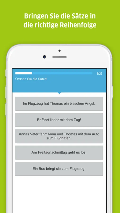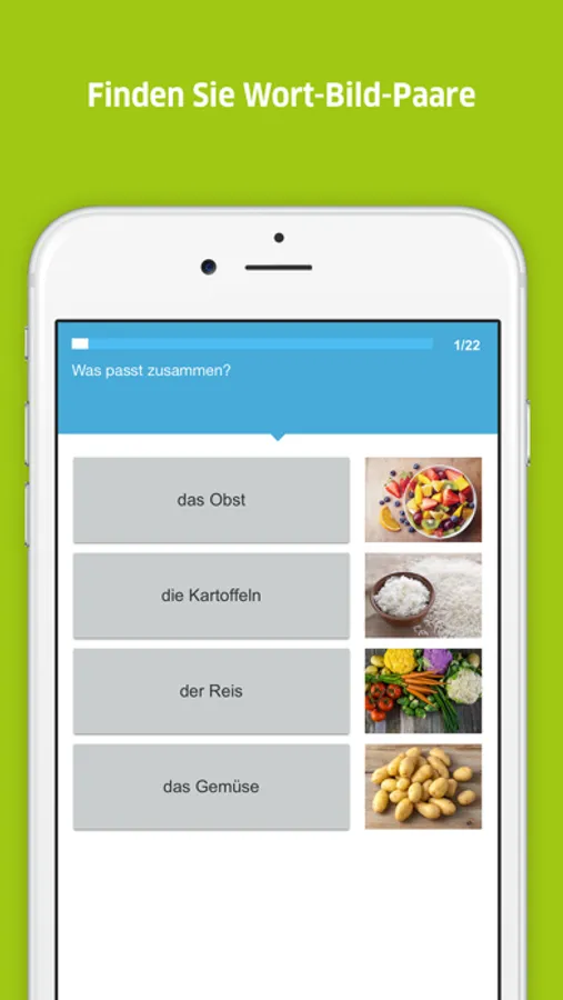 With this beginner level app you can easily start learning German. The app has 10 chapters. In each chapter, you will learn vocabulary and structures related to a topic in everyday life in about 20 exercises. You practice numbers, names of food, furniture and professions. The app combines listening, reading and writing and helps you practice basic vocabulary.