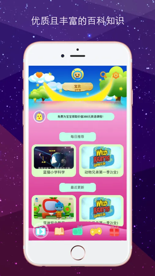 儿童百科是专门为儿童设计的互动百科应用程序,内容根据儿童的特点进行筛选,把天文地理科学知识用简明易懂的方法融入到应用中去。利用交互和游戏的方式引导儿童阅读,更有效启发儿童对未知事物的探索兴趣。让宝宝在探索知识的同时获得游戏的乐趣,也能很好地锻炼宝宝的观察力和专注力。