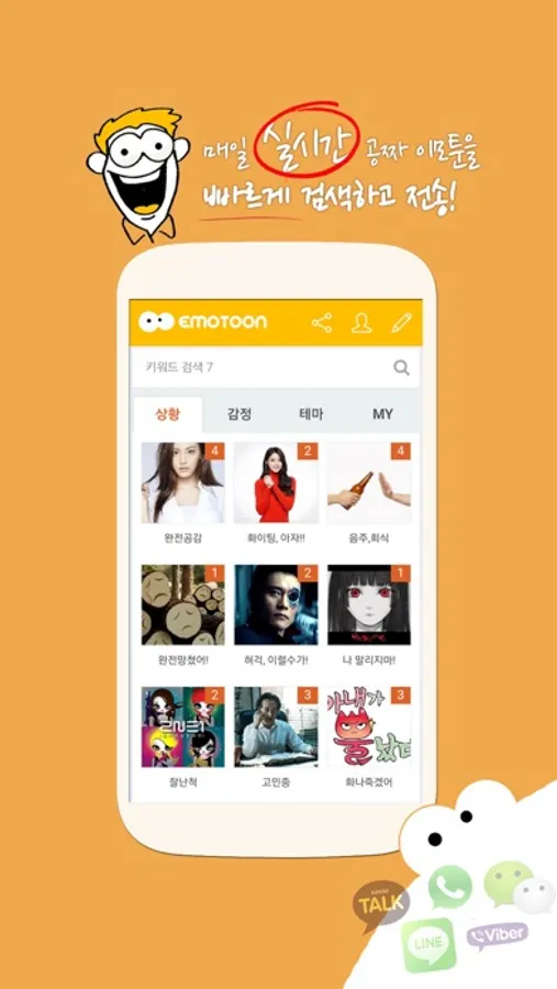 - 이모티콘 소셜 검색 및 전송기능 (카카오톡, 라인, 위쳇, Whats app 등 주요 쳇앱 호환지원)