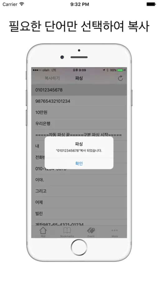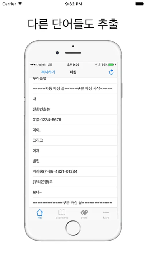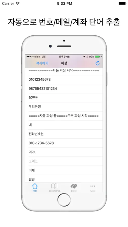 이앱의 자동 파싱 기능을 통하여 전화번호/이메일/계좌번호가 추출됩니다.