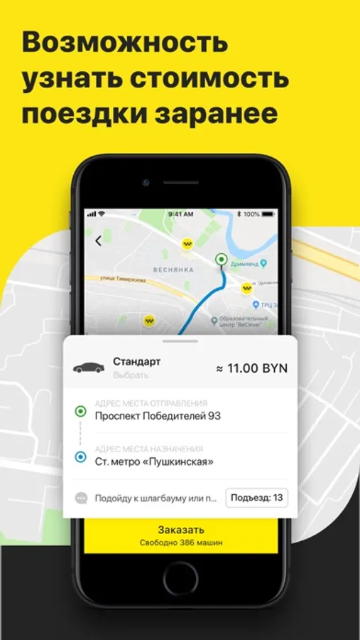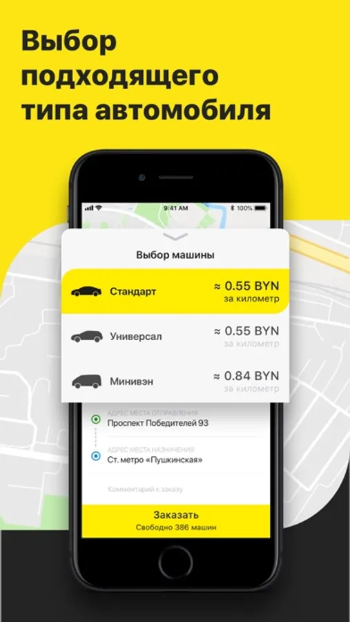 Задайте маршрут, выберете тип автомобиля – и машина уже выдвигается к Вам. Кроме этого, Вы будете видеть информацию о времени прибытия и местоположении водителя, принявшего заказ, а также маршрут, по которому к Вам движется автомобиль. При формировании заказа вы сразу будете знать о тарифе такси в зависимости от типа кузова автомобиля, сможете предварительно рассчитать примерную стоимость поездки с учетом абонирования и километража.