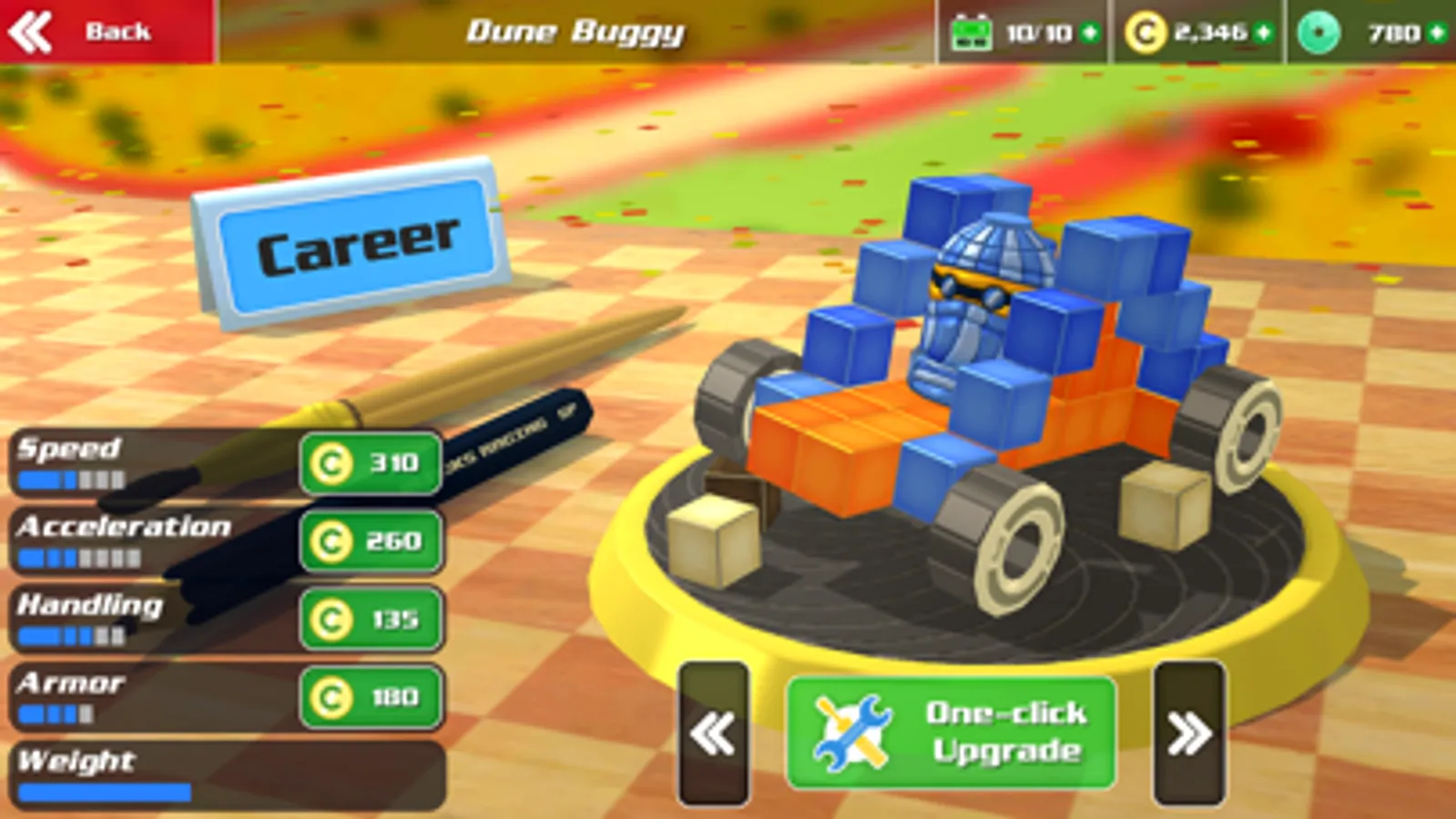 Upgrade race car stats to increase performance and voxel destruction prototype survivability to win pixel games.