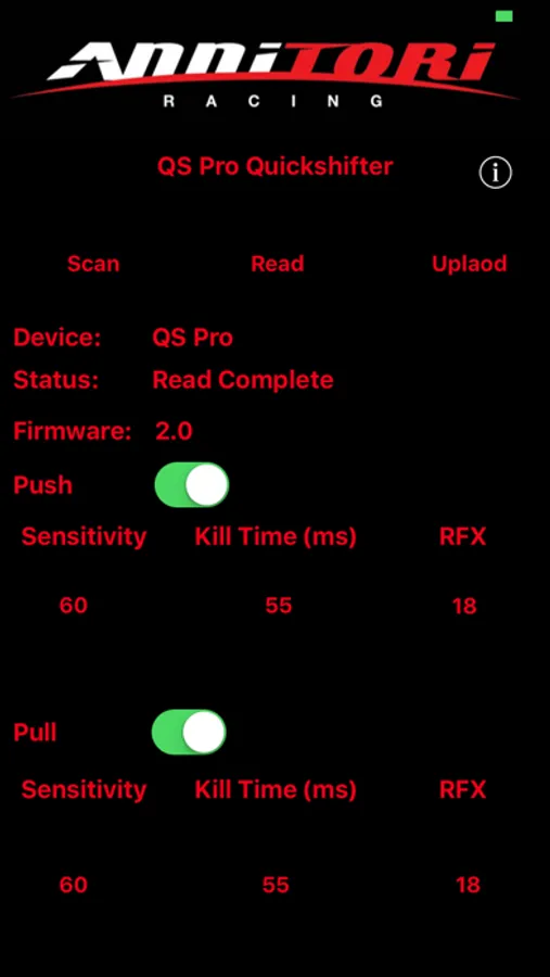 12) The shifter comes pre-set with both directions Enabled, 60 Sensitivity, 55ms for Kill Time and RFX 18. (If you do not have these settings on initial use, please change and UPLOAD so you can start from the base values.)