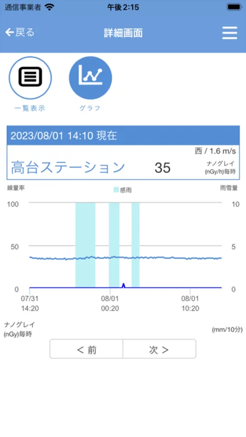 また、GPS機能により近隣の観測局を検索したり、各観測局ごとの線量率と雨雪量の時系列グラフを表示することができます。