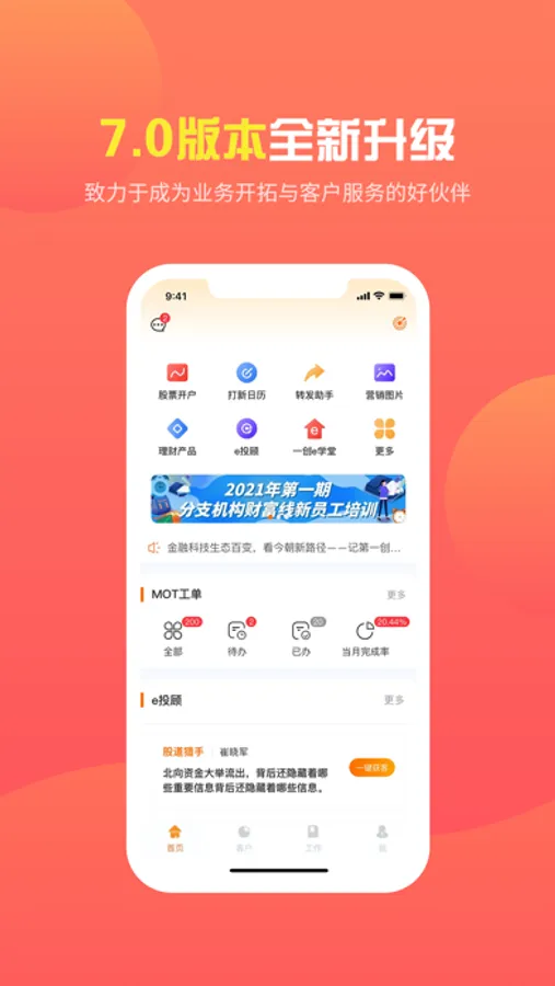 上市券商大平台,为证券经纪人、投资顾问等提供多种职业发展路径,免费提供海量行业资讯、业务知识、合规信息,全方位培训助力证券经纪人、客户经理、投资顾问等综合能力提升。