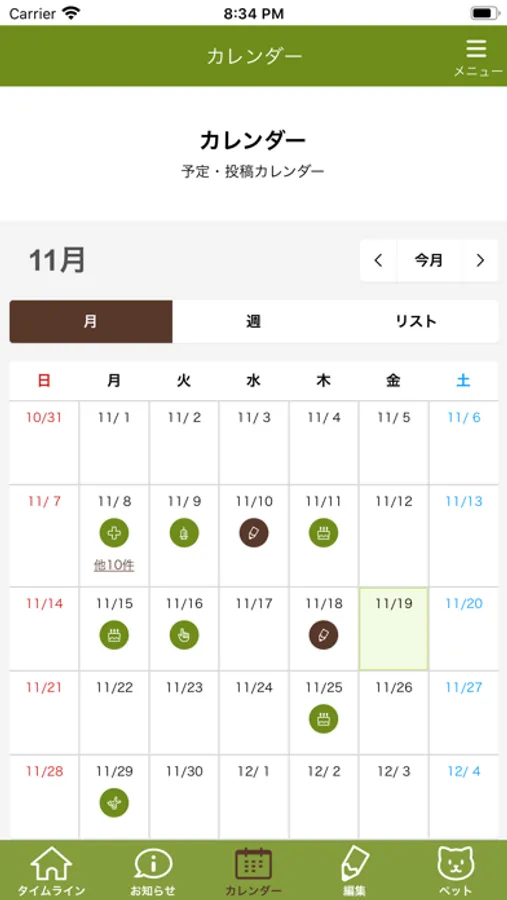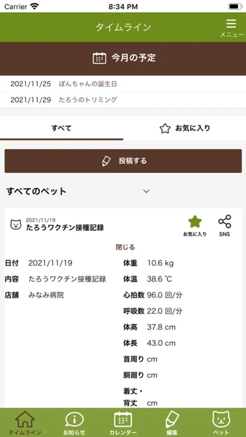 おともだち機能を利用して、家族とタイムラインを共有することができます。予定や健康状態なども家族みんなで見守ることができるため、家族での情報共有に最適です。