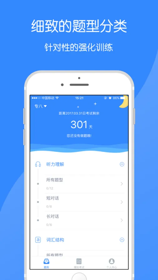 本软件暂时仅支持选择题的答题,因此专四专八考试中的听写、时态填空、翻译、写作部分真题暂未收录。
