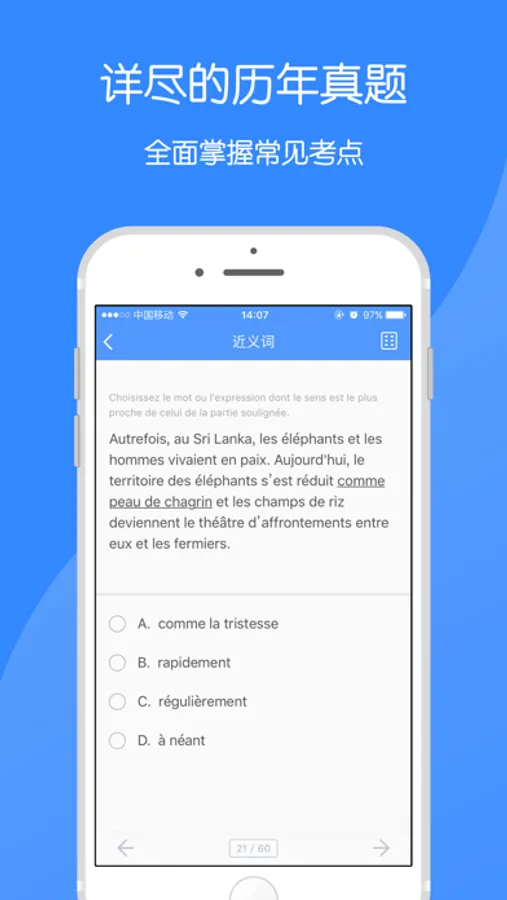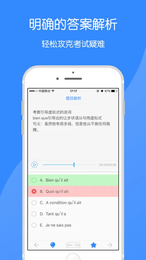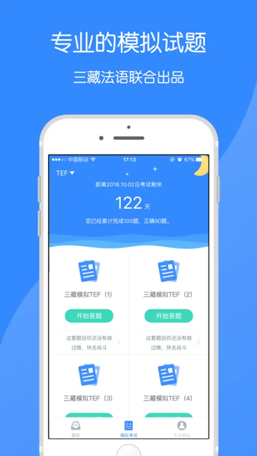 本软件中的TEF、TCF模拟试卷由三藏法语编辑出品。三藏法语,创立于2014年初,现已成为国内法语线上培训领军机构。自创办以来,已有近万名学员通过《TEF-TCF考试强化班》的课程达到各自理想成绩,顺利抵达法兰西。